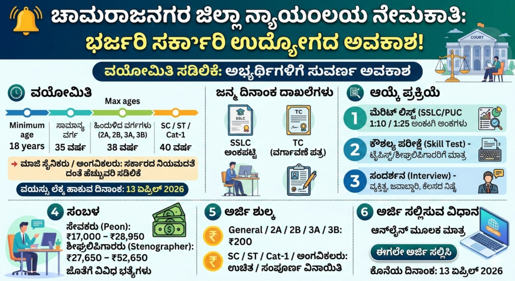 ಉದ್ಯೋಗ ಪ್ರಿಯರಿಗೆ ಭರ್ಜರಿ ಗುಡ್ ನ್ಯೂಸ್! ಕರ್ನಾಟಕದ ಗಡಿ ಜಿಲ್ಲೆ, ಕಪ್ಪು ಶಿಲೆಯ ನಾಡು ಮತ್ತು ವನ್ಯ ಸಿರಿಗಳ ತವರು ಚಾಮರಾಜನಗರದಲ್ಲಿ ಉದ್ಯೋಗ ಮಾಡಬೇಕೆಂದು ಅದೆಷ್ಟೋ ಯುವಕ-ಯುವತಿಯರ ಕನಸಾಗಿರುತ್ತದೆ. ಅಂತಹ ಅಭ್ಯರ್ಥಿಗಳಿಗೆ ಈಗ ಅತ್ಯುತ್ತಮವಾದ ಸುವರ್ಣ ಅವಕಾಶವೆಂದು 2026 ನೇ ಸಾಲಿನ ಮಾರ್ಚ್ ತಿಂಗಳಲ್ಲಿ ಕೂಡಿಬಂದಿದೆ. ಚಾಮರಾಜನಗರ ಜಿಲ್ಲಾ ಮತ್ತು ನ್ಯಾಯಾಲಯವು ವಿವಿಧ ಹುದ್ದೆಗಳ ಬರ್ತಿಗಾಗಿ ಹೊಚ್ಚಹೊಸ ನೇಮಕಾತಿ ಅಧಿಸೂಚನೆ ಒಂದನ್ನು ಪ್ರಕಟ ಮಾಡಿದೆ.