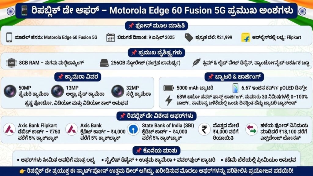 ಮೋಟೊರೋಲ ಎಡ್ಜ್ 60 ಫ್ಯೂಶನ್ ಸ್ಮಾರ್ಟ್ ಫೋನ್ ಆನ್ಲೈನ್ ನಲ್ಲಿ ಖರೀದಿಸಲು ಲಭ್ಯವಿದ್ದು, ಫ್ಲಿಪ್ಕಾರ್ಟ್ ಸಂಸ್ಥೆಯು ರಿಪಬ್ಲಿಕ್ ಡೇ ಪ್ರಯುಕ್ತ ಬ್ಯಾಂಕ್ ಕಾರ್ಡ್ ಆಫರ್ ಗಳನ್ನೂ ನೀಡಲು ಸಜ್ಜಾಗಿದೆ. ಈ ಸ್ಮಾರ್ಟ್ ಫೋನ್ ಖರೀದಿಸುವ ಗ್ರಾಹಕರಿಗೆ ಆಕ್ಸಿಸ್ ಬ್ಯಾಂಕ್ ಫ್ಲಿಪ್ಕಾರ್ಟ್ ಡೆಬಿಟ್ ಕಾರ್ಡ್ ಮೇಲೆ ₹750 ರ ವರೆಗೆ 5% ಕ್ಯಾಶ್ ಬ್ಯಾಕ್ ಆಫರ್ ನೀಡಲಾಗಿದೆ.