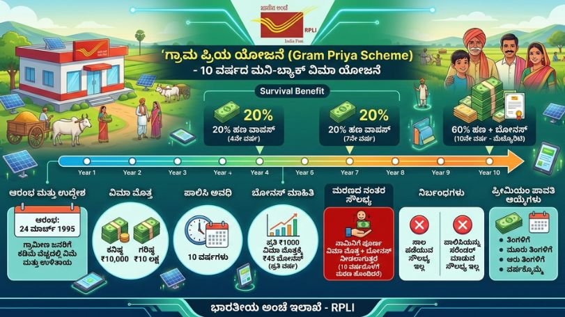 ಗ್ರಾಮೀಣ ಭಾರತದ ಆರ್ಥಿಕ ಸಬಲೀಕರಣಕ್ಕಾಗಿ ಭಾರತೀಯ ಅಂಚೆ ಇಲಾಖೆಯು ಜಾರಿಗೆ ತಂದಿರುವ ಅಧ್ಬಿತ ಹಣ ಪಾವತಿ ವಿಮಾ ಯೋಜನೆಗಳಲ್ಲಿ ‘ಗ್ರಾಮ ಪ್ರಿಯ’ (10-Year RPLI) ಬಹಳಷ್ಟು ಅಗ್ರಸ್ಥಾನದಲ್ಲಿದೆ. ಇದು ಕೇವಲ ಒಂದು ವಿಮೆಯಲ್ಲ, ಬದಲಿಗೆ ಹಳ್ಳಿ ಜನರ ಬದುಕಿಗೆ ಭಧ್ರ ಬುನಾದಿ ಯೋಜನೆ.
